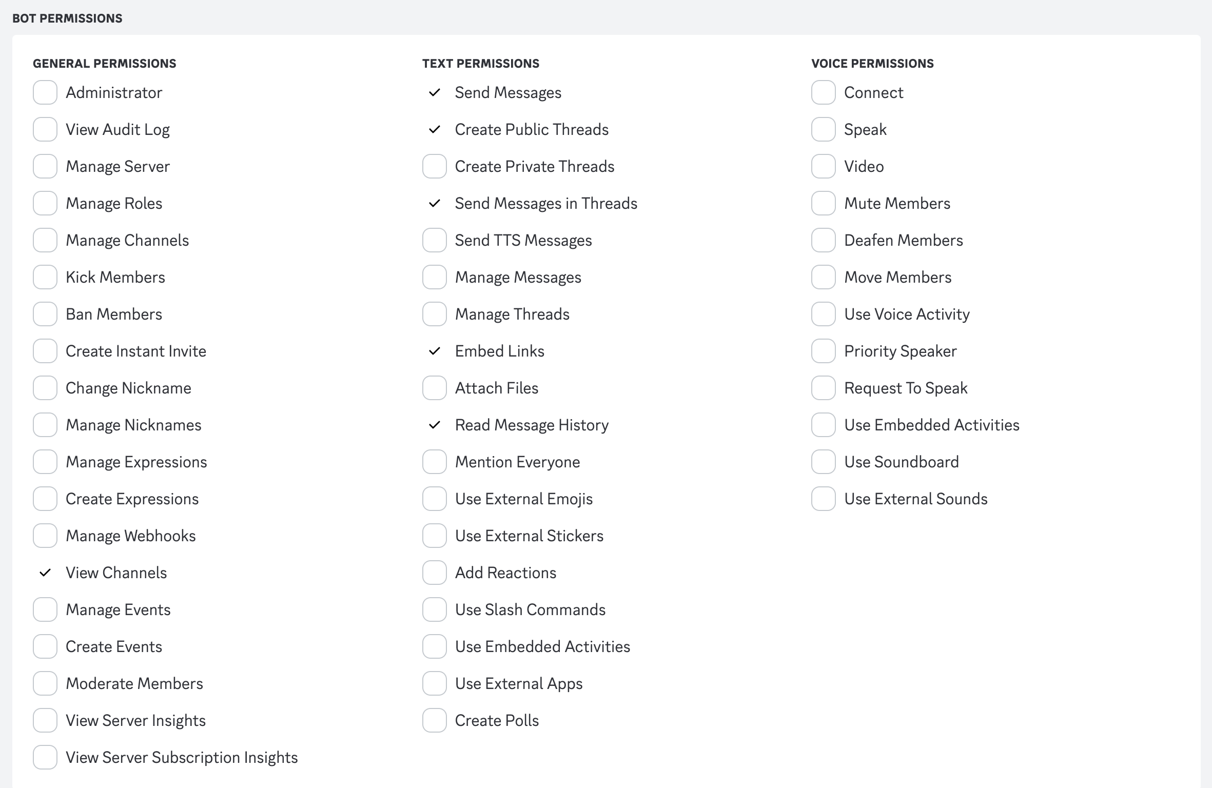 - Under “Default Install Settings”, and under “Guild Install”, add “bot” to the “Scopes”. Then, “Permissions” will become visible. Then add the following permissions: