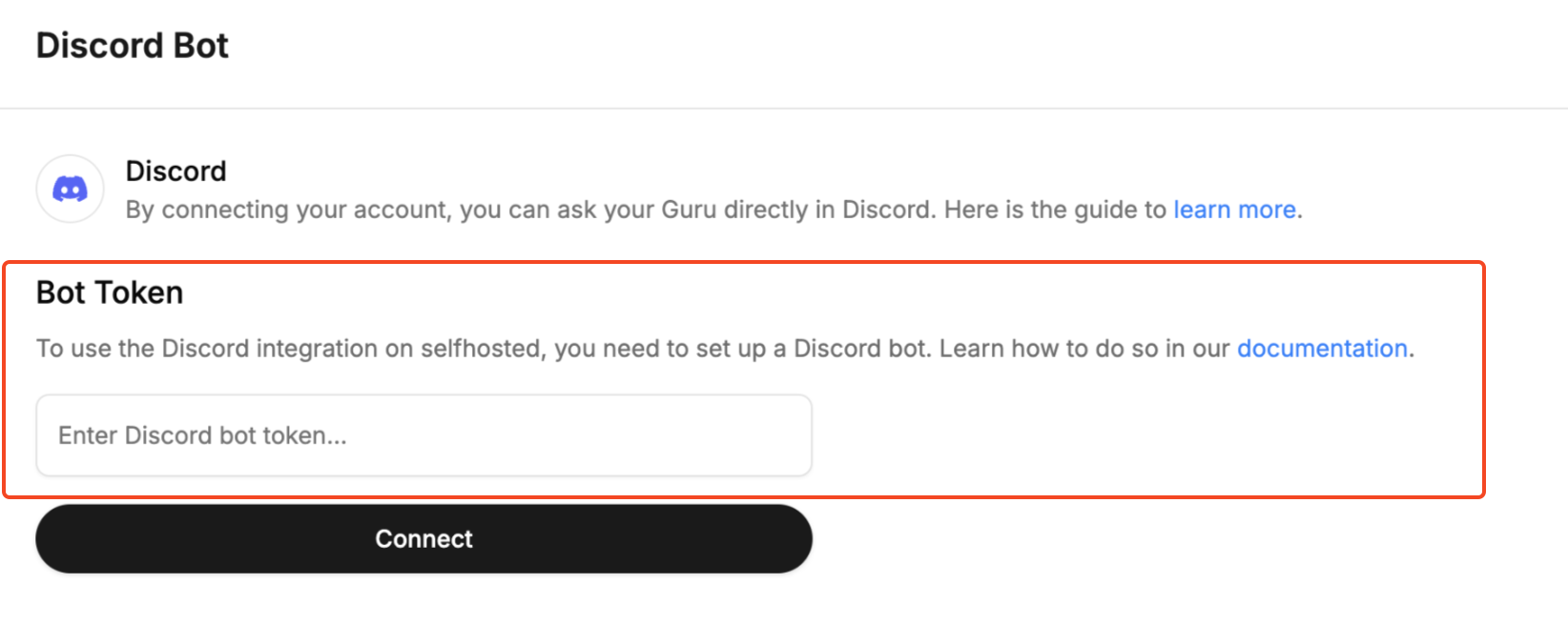 - Go to your guru’s Discord integration page in the Gurubase UI and paste the bot token you copied.