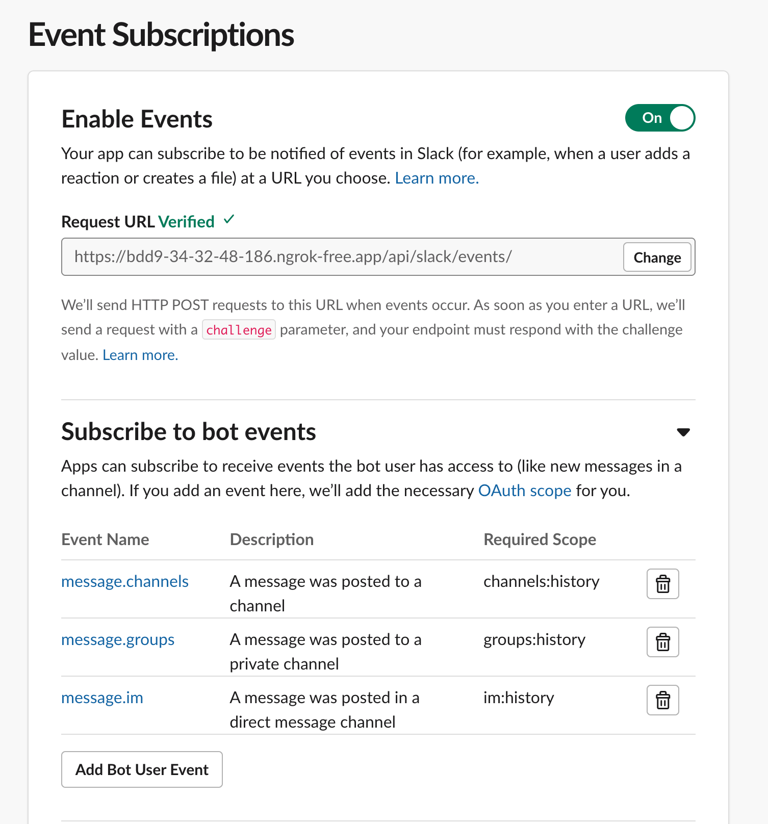 - Go to “Event Subscriptions” page on your Slack app and enable it. Expand the “Subscribe to bot events” section and add the following events: