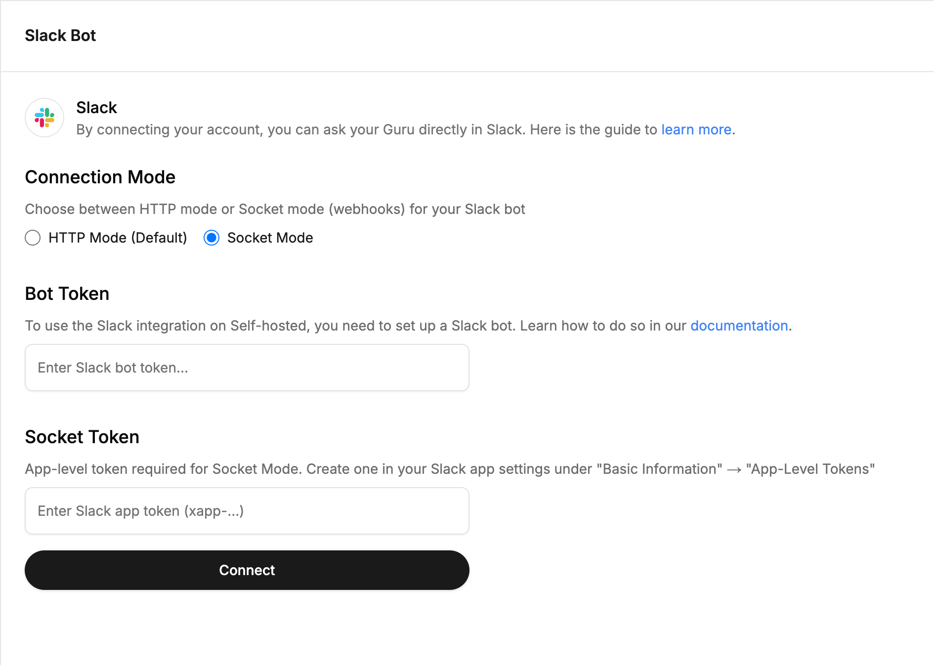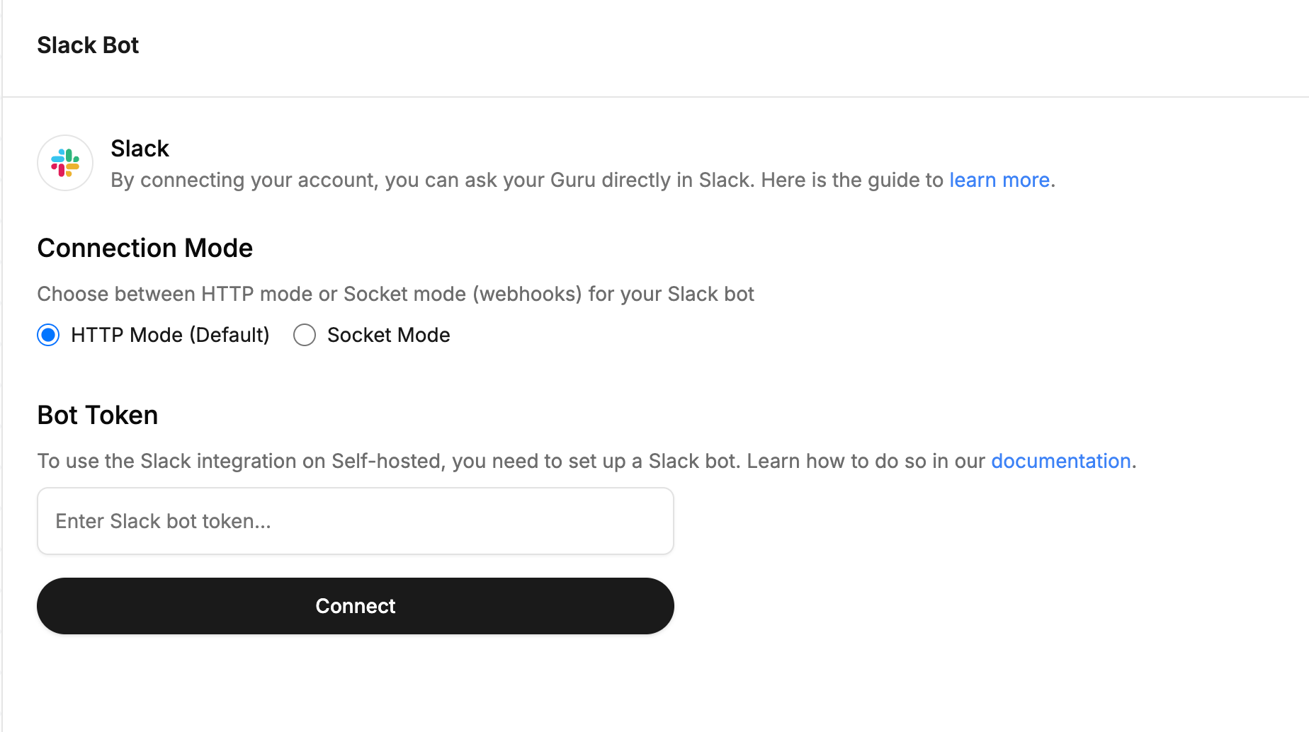 - Go to your Guru’s Slack integration page in the Gurubase UI. Here, depending on your desired settings, either select HTTP or Socket mode.