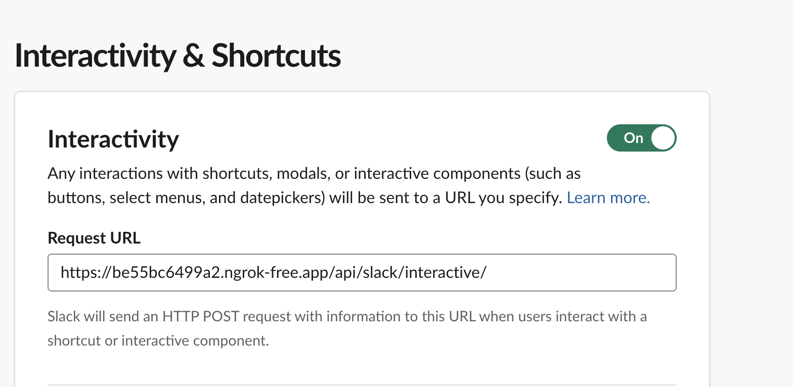 Go to “Interactivity & Shortcuts” page on Slack App. Enable it and set the Request URL as