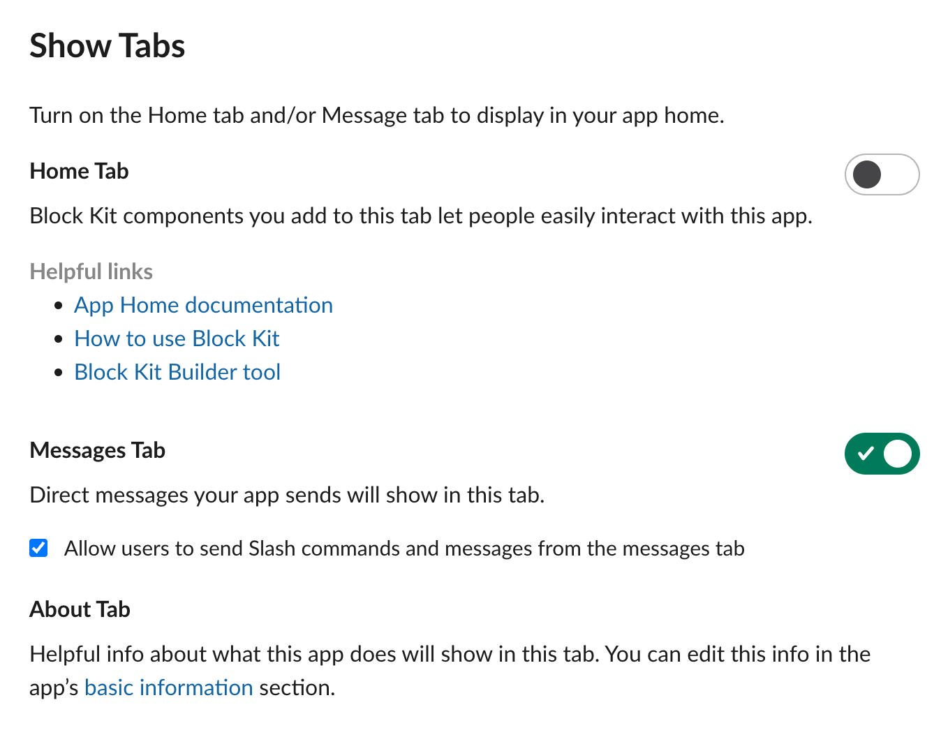 - Under “Show Tabs”, enable “Messages Tab” and tick “Allow users to send Slash commands and messages from the messages tab”.