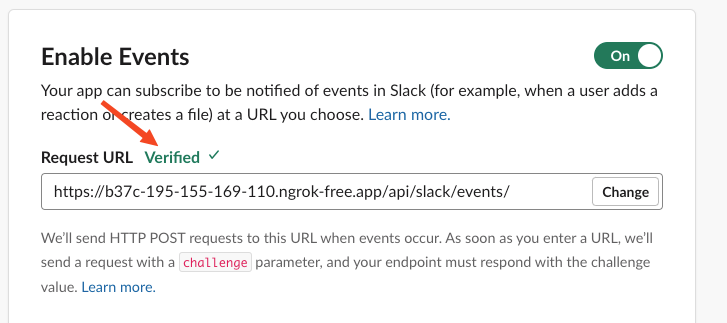 - Go to “Event Subscriptions” page on your Slack app and enable it.